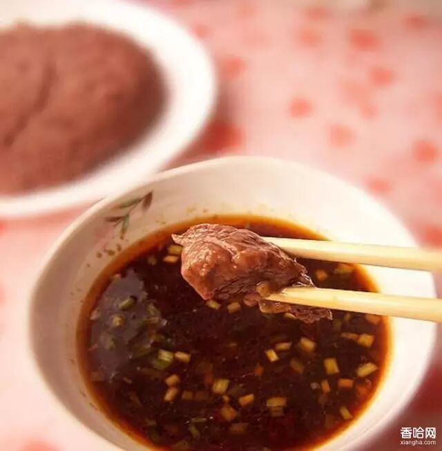 蘸糊糊是平遥人的一种粗粮吃法,主要用高粱面做,做法也很简单,把面搅到水里,温火慢慢熬,并且不停地搅,一直熬成糊糊状,可以用筷子把面糊糊夹起来,糊糊就做好了。然后往油锅里倒上油,烹上葱花调料辣椒面,再加水熬成汤,蘸糊糊的两道工序就完成了。
