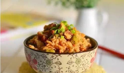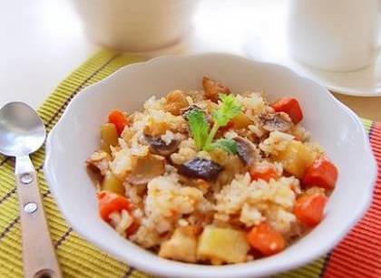 3、米洗净沥干水分,放入电锅中,加入切好的鸡肉、香菇、胡萝卜、笋、高丽菜等,并入酱油、盐、糖、酒、麻油、橄榄油、浸香菇的水及高汤拌匀,煮成饭后趁热拌松,即可食用。
