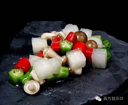 6、锅内倒适量油烧热,放姜爆香,放入秋葵、红杭椒、蟹味菇,用旺火爆炒,转小火加少许水,调味蘑菇精、盐烧开,焖一会儿,放入冬瓜粒,待冬瓜入味后,勾一点点薄芡,出锅装在石板上即可。