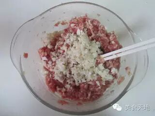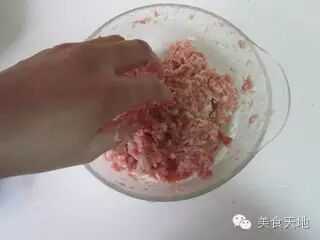 肉末中加入适量1个鸡蛋、盐、姜末、胡椒粉和淀粉, 顺着一个方向搅动上劲;