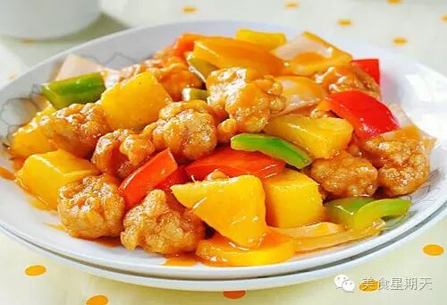 食材:里脊猪肉500g、菠萝150g、彩椒适量、洋葱适量、姜适量、蛋清适量、盐适量、胡椒粉适量、淀粉适量、番茄酱适量、米醋适量、白砂糖适量