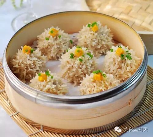 6)做好的珍珠丸子码放在笼里,蛋黄丁装饰,中火蒸25——30分钟即可。