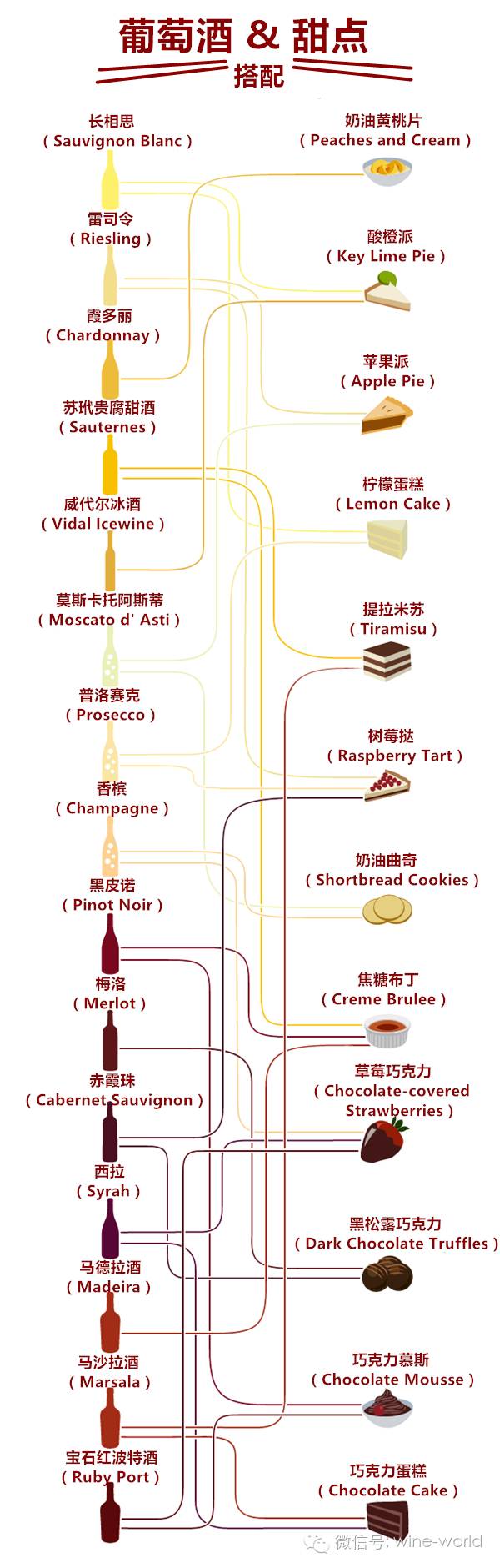 下面,就请认真参考小编为你奉上的葡萄酒与甜点搭配图吧!