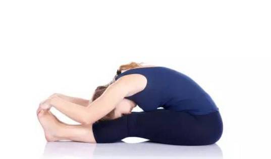d 呼气,曲肘,通过肘部把躯干向前拉伸,让前额贴在膝盖上。肘部逐渐放在地面上,伸展颈部和躯干,用鼻子贴近膝盖。试着尽量保持体式从1-5分钟,慢慢延长,均匀地呼吸。