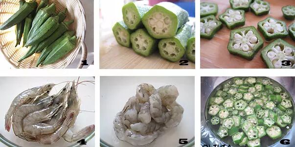 1、取秋葵适量。切去顶端较老的部分。再切成段状,有一定厚度,以免焯水的时候营养流失。取鲜虾适量。去虾线虾壳,剥成虾仁后在水中清洗两遍。切好的秋葵在沸水中焯20秒左右,捞出后过冷水。