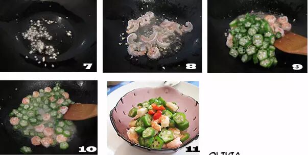 2、加热炒锅,倒入食用油,蒜末炒香。把虾仁放入锅中炒变色。再倒入焯好的秋葵段。翻炒均匀,出锅前加入适量盐调味。盛出装饰即可。
