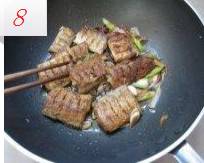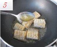 8.转成小火,端起炒锅轻轻晃动,让调料混和在一起,再将鱼煎约10秒钟,翻面再煎10秒钟,至带鱼上色。