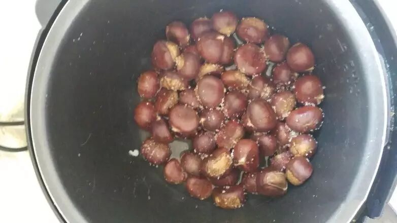 第三步,加少许水,和白糖(水只要一点点即可,不用漫过板栗的哦),高压锅压15分钟