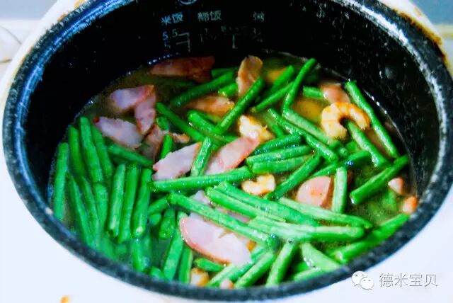 再将豇豆、香肠和虾仁铺在米上,并撒上适量盐,选择“煮饭”功能,静待饭熟即可