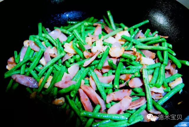 锅中烧热油2大匙,放入虾仁,大火炒香后下香肠,翻炒数下到香肠变色半熟时,再下豇豆,一起翻炒1分钟至豇豆半熟即可熄火
