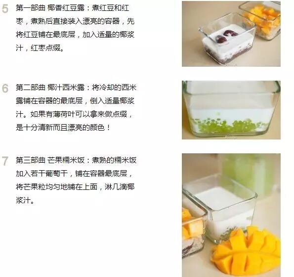 泰式甜品的精髓就是椰浆和芒果啦!分别由:椰香红豆露、椰汁西米露、芒果糯米饭组成。不仅好吃还对身体特别好。妈妈们做来给小朋友吃,颜色搭配十分漂亮,孩子们会很喜欢。老婆做给老公吃,是表达浓浓爱意的不二法宝。主人也可以用来招待客人,步骤简单不复杂,整个过程耗时不超过一小时。也可以添加自己喜爱的水果:西瓜、哈密瓜、菠萝、草莓等等…