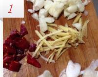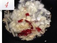 4. 油比平时炒菜多放一些,防止粉丝粘锅。放入葱姜蒜干辣椒炒香,放入肉丝,炒至变色。