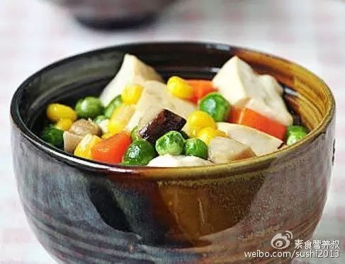 食材:豆腐,豌豆,玉米粒,香菇,木耳,胡萝卜,酱油,盐,糖,蘑菇精,淀粉