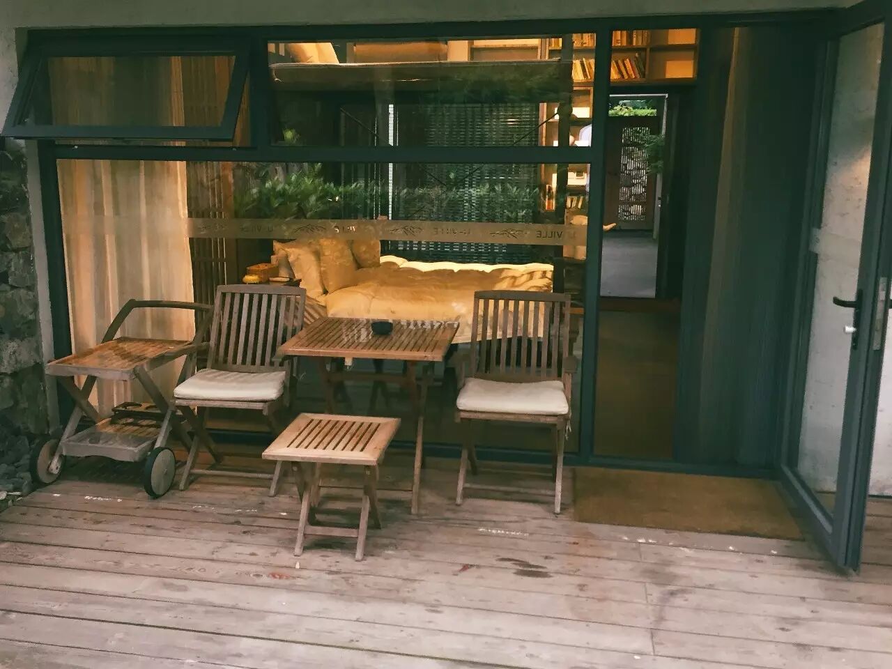 房间外一边的露台对着一片绿植和水域,晚上不关门睡觉,就能听着流水滴着叶子的声音睡着。另一边则有一个恒温的室外泡澡池,适合放松心情。