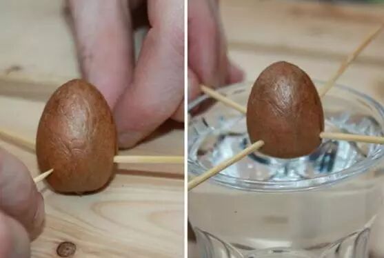 3 用四根牙签插入种子的侧面,大约5毫米深,然后尖端向上放到盛水的杯子里,水最好漫到种子的一半。