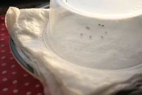 2 在浅口小碟上铺上浸湿的纸巾,将小种子倒在纸巾上,上面覆盖一个钻有小孔的塑料容器,保证空气流通。