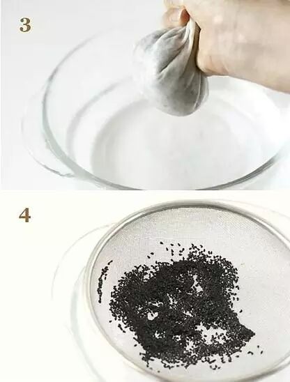 2 将泡软的果肉倒入丝状布中,放在水里浸泡1天,隔天继续搓揉,将果肉全部挤出,取出种子平铺于盘子上,用纸巾吸干果实表面的水。