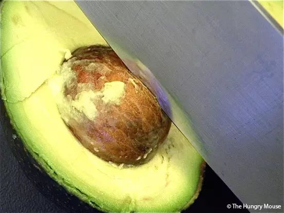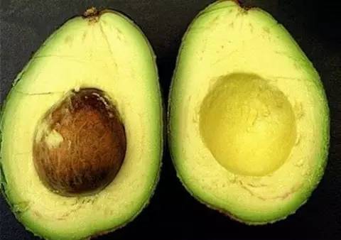 1 将牛油果切成完好的两半,取出种子。