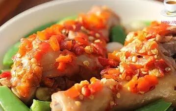 2、用手按摩均匀,放入冰箱中冷藏两个小时以上,将腌好的鸡腿取出放入盘中,上面铺上一层剁椒。