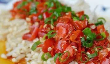 5、将肉糜(或肉末)放在豆腐上,表面撒一层青红椒粒(或剁椒),浇上一层蒸鱼豉油。