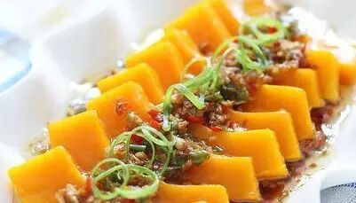 1、南瓜去皮去瓤洗净,切成厚约0.3厘米的片,码入盘中