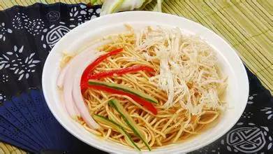 材料:龙须面(鸡蛋)200克、橄榄油50毫升、开洋20克、鲜酱油30毫升、榨菜15克、料酒10毫升、小葱20克。