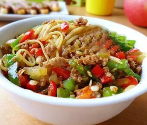 材料:猪肉200克、青椒1个、红椒1个、西芹少许、面条150克、生抽1茶匙、食盐少许、料酒1茶匙。