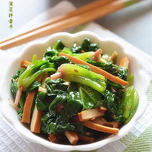 5、将改刀后的菠菜和香干放入碗中,并加入调味料:盐、鲜酱油、芝麻油、少许花椒油和白芝麻;