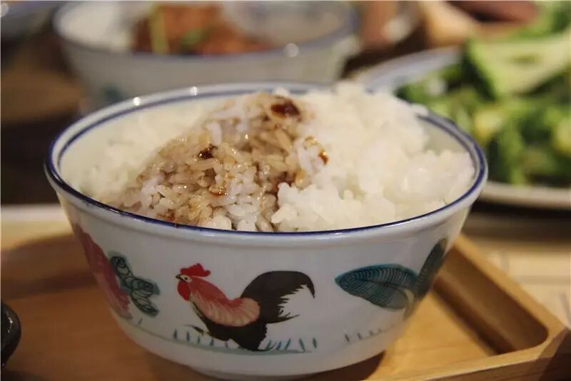 一碗白饭,一碟卤儿,就是杭州人说的“卤儿道道”。白米饭很有讲究,蒸的过程中加了一点土猪肉的猪油和一点点鸡汁,粒粒分明。缓缓地在米饭上方洒上一圈卤儿,让人想起来小时候的猪油拌饭。