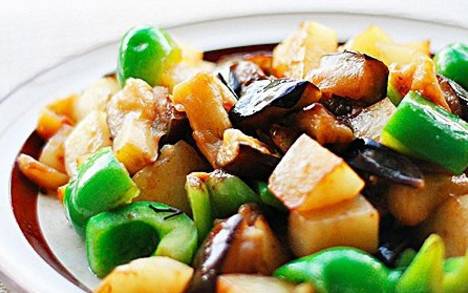 材料:茄子1个;芝麻油少许;土豆2个;青椒1个;花椒5粒;姜片2片;蒜2瓣(可不下);糖10克、生抽20ML;盐5克、水淀粉40ML