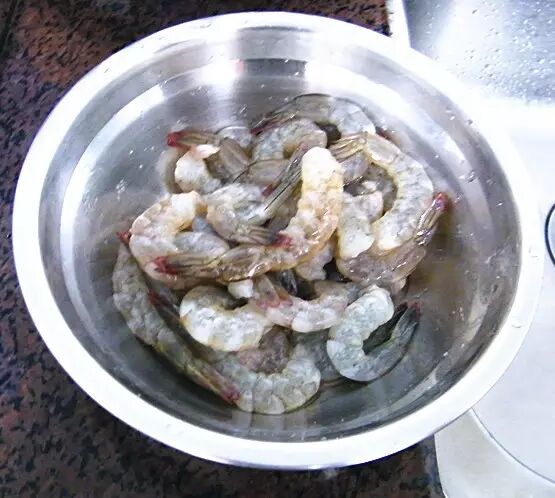 把买回来的活虾放到冰箱冷冻层,需要吃的时候拿出来解冻,清洗,剥壳剩尾巴,加入适量盐,翻拌使入味均匀。