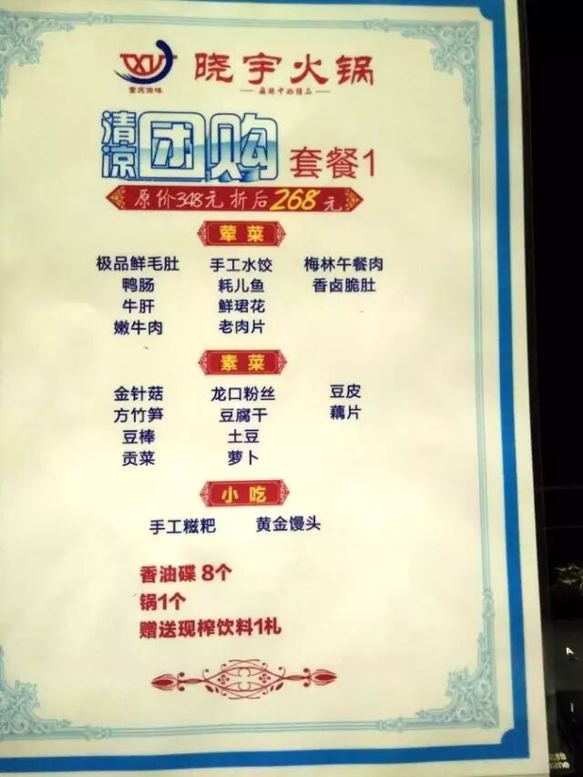 套餐二:原价348元套餐现团购价仅需268元,送现榨饮料1扎;
