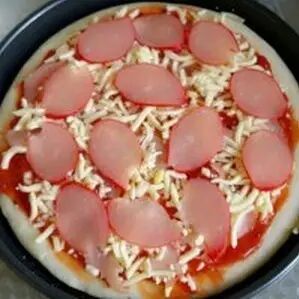 2、烤盘内图黄油防止粘锅,放入饼底,涂上披萨酱,然后撒少许芝士碎,放上火腿片