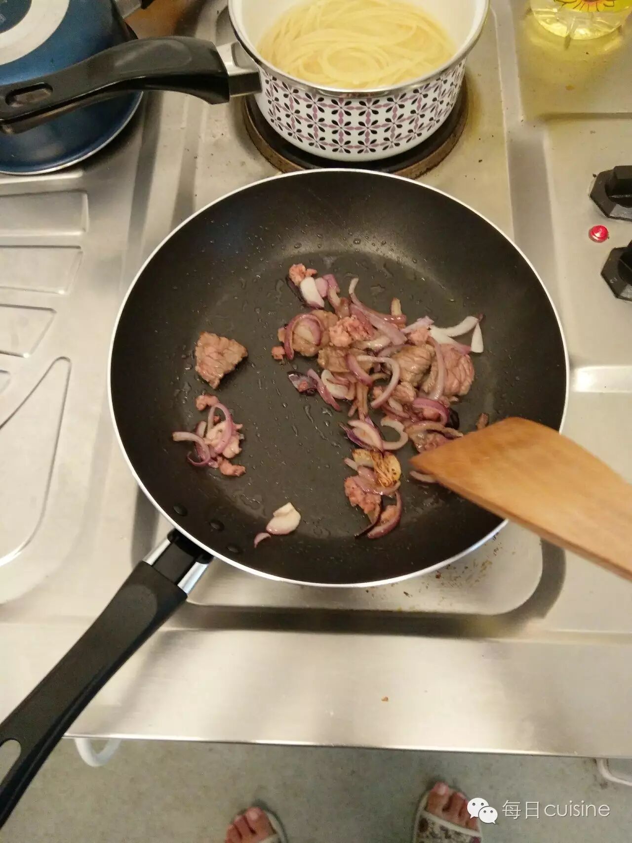 1、锅烧热,油烧热,放洋葱下锅炒。同时另一个锅烧水煮面。