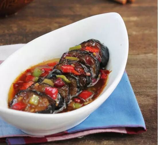 3.等十多分钟,用手攥一下茄子,可以把茄子中的水分寄出一部分,不用记得太干,不然反倒不好吃了。这样做不仅省油而且省火。