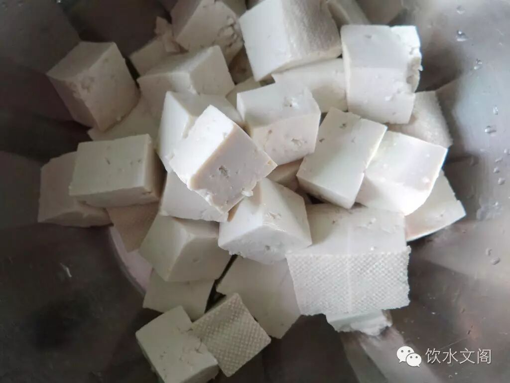 将豆腐切成均匀小块,锅内烧开水,将切好的豆腐夯水,捞出备用