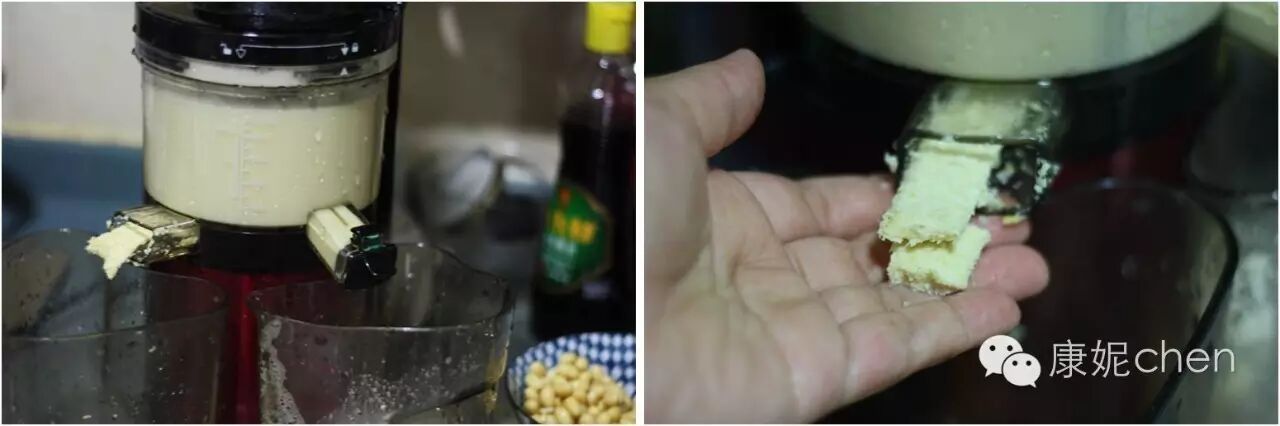 3用原汁机磨出浓郁的豆浆,原汁机一边出豆渣,一边出浓郁豆浆,豆渣比较干的