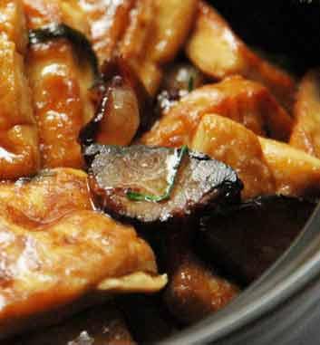 3、趁锅内余油,下蒜茸、芹菜粒、椒粒、堡仔酱爆香,接着下鸡粒炒匀,加入绍酒、上汤及茄瓜条和以上味料和炸香咸鱼茸,略焖片刻,调入少许生粉,加入包尾油。转盛入瓦煲里,加热至滚,下香油、葱花,加盖上桌即可。