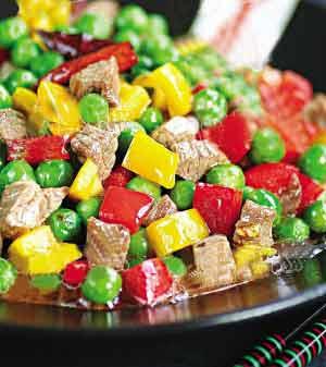 3)炒锅中倒入油,待7成热时,放入干辣椒和姜片爆香,然后放入牛肉粒翻炒2分钟,脱生后倒入豌豆和红黄椒丁,再调入蚝油和盐,翻炒几下即可出锅。