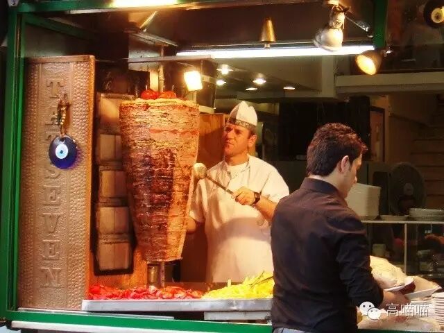 Doner kebab,土耳其烤肉,在圆盘上转转转的,常见鸡肉和羊肉。同样是在圆盘上转的,在希腊叫Gyros(有兴趣可以查查gyro-在英语里做词根的意思),但除了羊肉鸡肉,还有猪肉(原因不用说了)。