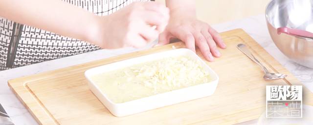 在装好盆的土豆泥上撒上一些得乐思马苏里拉刨丝干酪