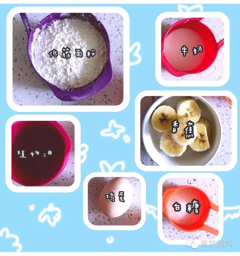 材料:鸡蛋1个,白糖20g,牛奶30ml,植物油40ml,低筋面粉100g,香蕉1根。
