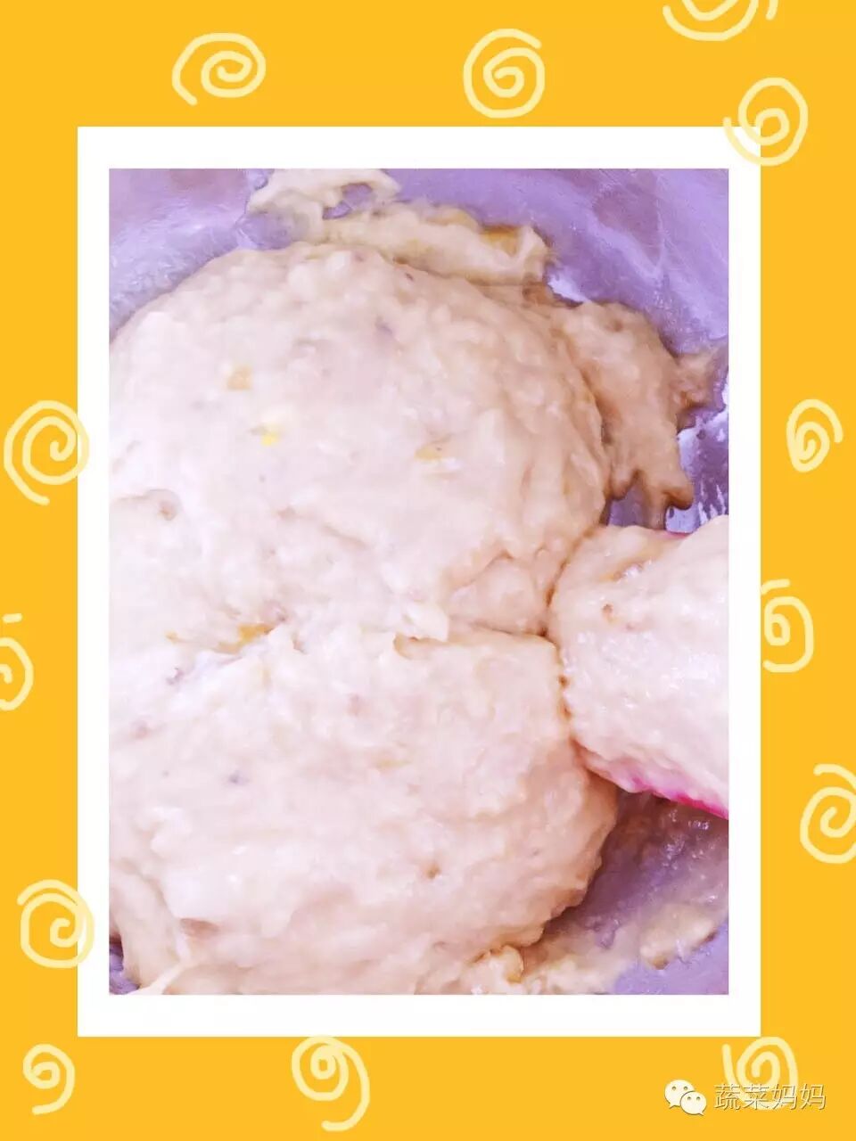1.将香蕉压成泥和牛奶,白糖、鸡蛋、植物油一起放入大盆里,将他们搅拌成糊状。