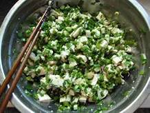 10:把豆腐和韭菜混合,调入少许盐、鸡精,淋入1汤勺熬熟但已冷却的香葱油,搅拌均匀。