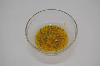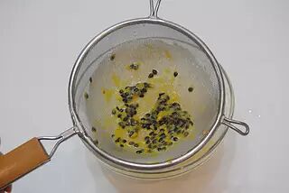 9. 过滤进布丁液里面,倒掉百香果籽,拌匀后再过滤一遍,静置20分钟