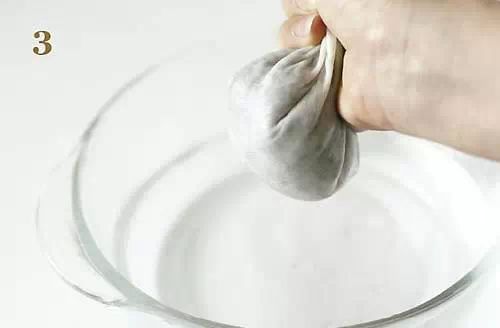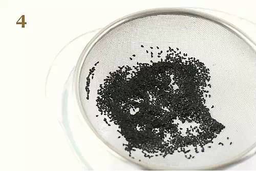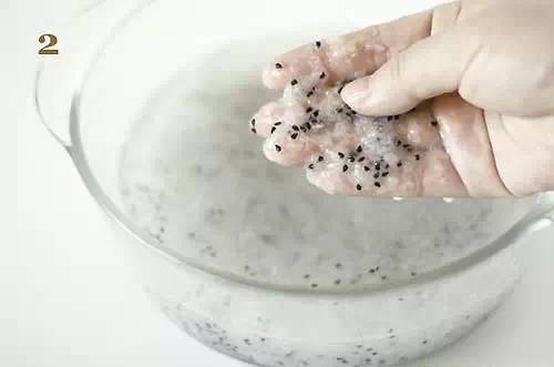 3.再将稀烂的果肉倒入短丝袜,继续搓揉几下,接著就泡水1天,不可泡水两天以上,否则会发芽,隔天再继续搓揉,可使果肉全部挤出,只剩黑色的种子,看起来有点像黑芝麻。