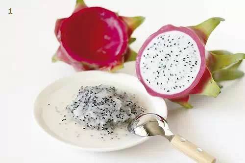 1.将火龙果切成两半,用不锈钢汤匙轻轻将果肉刮入容器中。