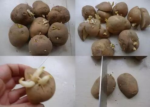 买土豆时专挑眼多的买,这样的土豆发芽率高。买回后放在塑料袋里,让它在自然条件下发芽。每个土豆上面都会有好几个小芽萌芽,有的还长出来了一些张牙舞爪的白生生的小根,啊,可以种了!
