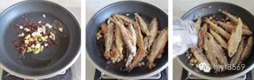 8、下入刚炸好的小鱼煸炒一下;