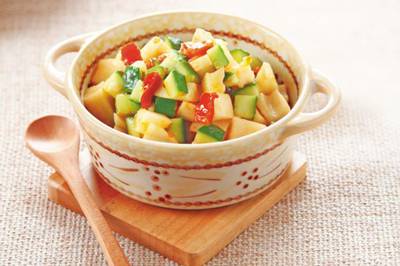 食材:主料山药200g莲藕150g黄瓜150g 辅料海天太子剁椒2茶匙精油2茶匙盐1茶匙大蒜4g鸡3g